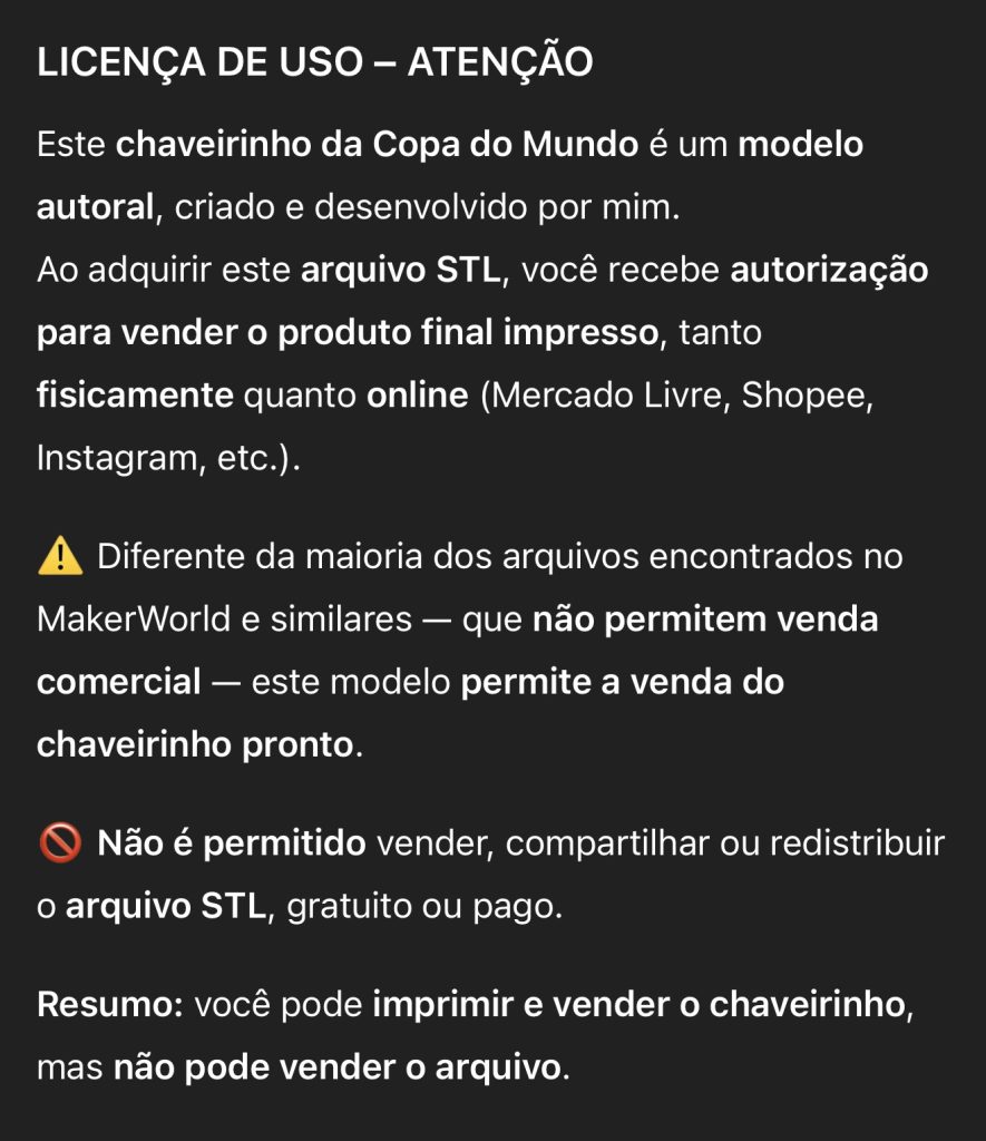 Você terá direito de produzir e vender o produto físico, tanto online quanto em lojas, Instagram e marketplaces como Mercado Livre.Ideal para quem quer transformar impressão 3D em renda com um modelo atrativo e de alta aceitação.